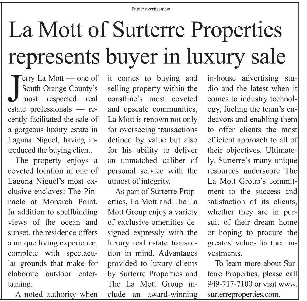 La Mott — one of South Orange County’s most respected real estate professionals — recently facilitated the sale of a gorgeous luxury estate in Laguna Niguel, having introduced the buying client.