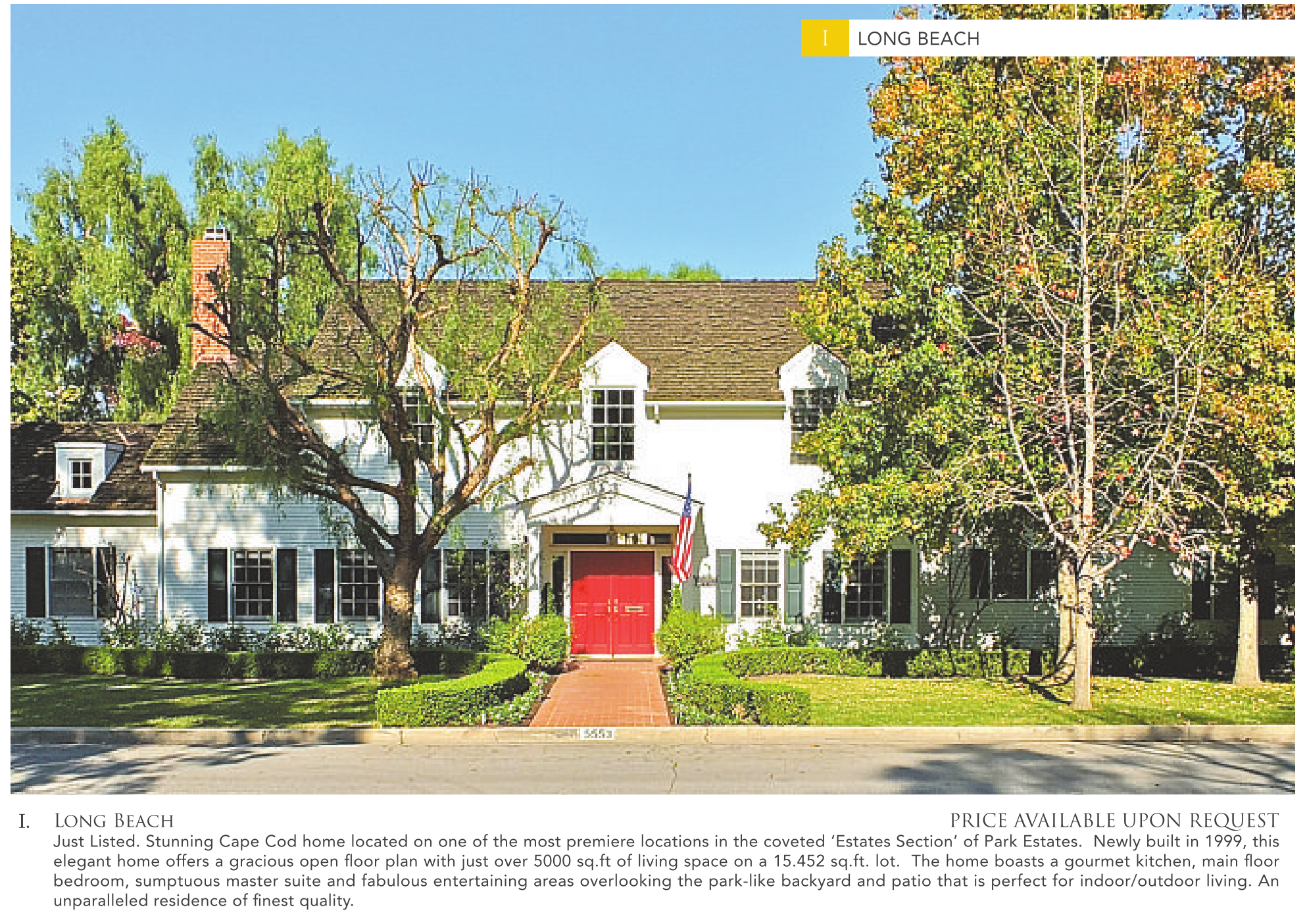 I. Long Beach PRICE AVAILABLE UPON REQUEST Just Listed. Stunning Cape Cod home located on one of the most premiere locations in the coveted ‘Estates Section’ of Park Estates. Newly built in 1999, this