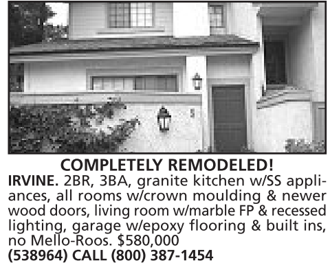 IRVINE. 2BR, 3BA, granite kitchen w/SS appliances, all rooms w/crown moulding & newer wood doors, living room w/marble FP &recessed lighting, garage w/epoxy flooring & built ins, no Mello-Roos. $580,000 (538964) CALL (800) 387-1454