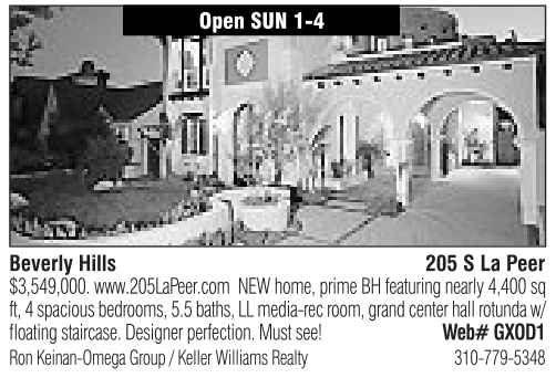 Beverly Hills Open SUN 1-4 205 SLaPeer $3,549,000. www.205LaPeer.com NEW home, prime BH featuring nearly 4,400 sq ft, 4spacious bedrooms, 5.5 baths, LL media-rec room, grand center hall rotunda w/ floating staircase. Designer perfection. Must see! Web# GXOD1 RonKeinan-Omega Group /Keller Williams Realty 310-779-5348 See also