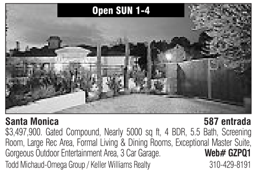 Santa Monica Open SUN 1-4 587 entrada $3,497,900. Gated Compound, Nearly 5000 sq ft, 4 BDR, 5.5 Bath, Screening Room, Large Rec Area, Formal Living &Dining Rooms, Exceptional Master Suite, Gorgeous Outdoor Entertainment Area, 3Car Garage. Web# GZPQ1 Todd Michaud-Omega Group /Keller Williams Realty 310-429-8191