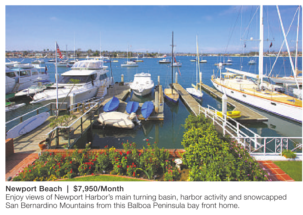 Newport Beach | $7,950/Month Enjoy views of Newport Harbor’s main turning basin, harbor activity and snowcapped San Bernardino Mountains from this Balboa Peninsula bay front home.