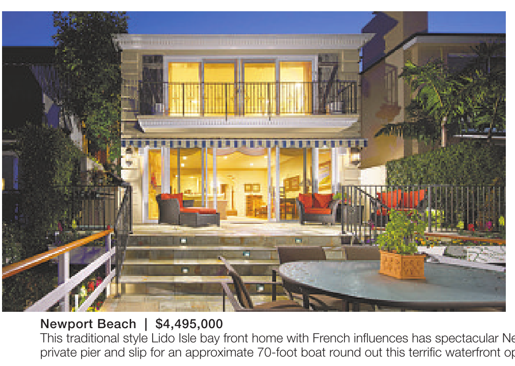 Newport Beach | $4,495,000 This traditional style Lido Isle bay front home with French influences has spectacular Newport private pier and slip for an approximate 70-foot boat round out this terrific waterfront opportunity.