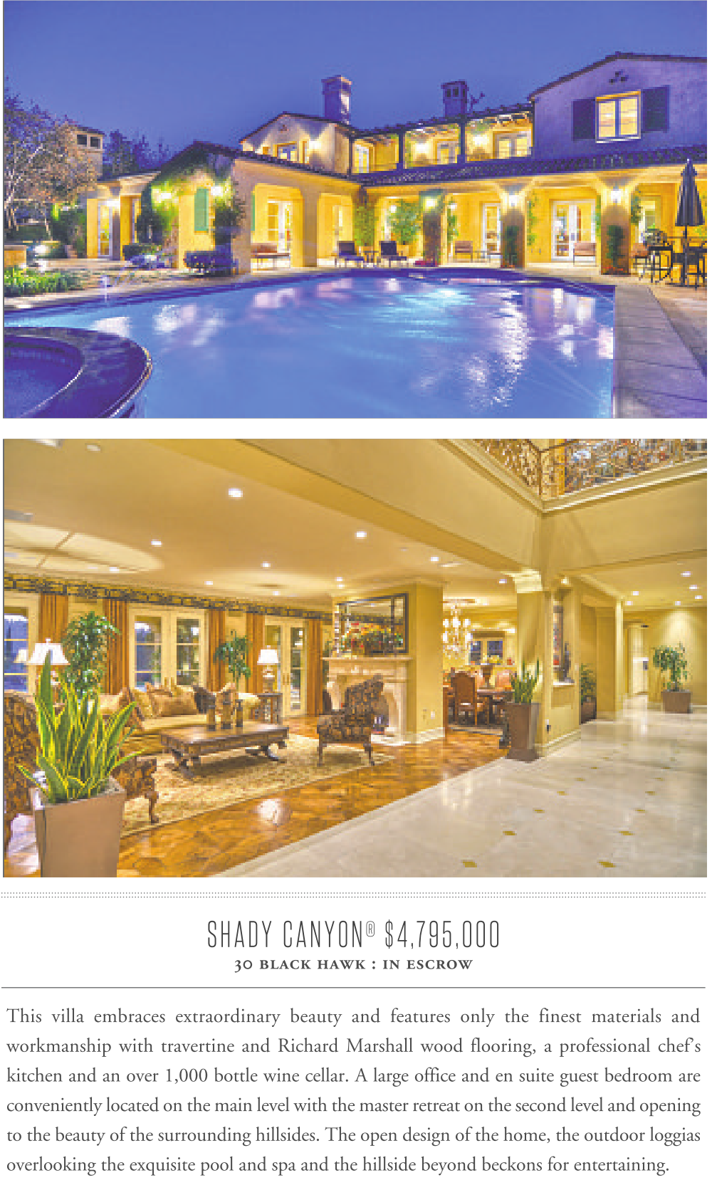 SHADY CANYON ® $4,795,000 30 black hawk : in escrow This villa embraces extraordinary beauty and features only the finest materials and workmanship with travertine and Richard Marshall wood flooring, a professional chef’s kitchen and an over 1,000 bottle wine cellar. A large office and en suite guest bedroom are conveniently located on the main level with the master retreat on the second level and opening to the beauty of the surrounding hillsides. The open design of the home, the outdoor loggias overlooking the exquisite pool and spa and the hillside beyond beckons for entertaining. See also