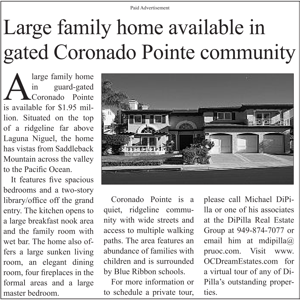 Paid Advertisement Large family home available in gated Coronado Pointe community Alarge family home in guard-gated Coronado Pointe is available for $1.95 million. Situated on the top of a ridgeline far above Laguna Niguel, the home has vistas from Saddleback Mountain across the valley to the Pacific Ocean. It features five spacious bedrooms and a two-story library/office off the grand entry. The kitchen opens to a large breakfast nook area and the family room with wet bar. The home also offers a large sunken living room, an elegant dining room, four fireplaces in the formal areas and a large master bedroom. Coronado Pointe is a quiet, ridgeline community with wide streets and access to multiple walking paths. The area features an abundance of families with children and is surrounded by Blue Ribbon schools. For more information or to schedule a private tour, please call Michael DiPilla or one of his associates at the DiPilla Real Estate Group at 949-874-7077 or email him at mdipilla@ pruoc.com. Visit www. OCDreamEstates.com for a virtual tour of any of Di- Pilla’s outstanding properties. See also
