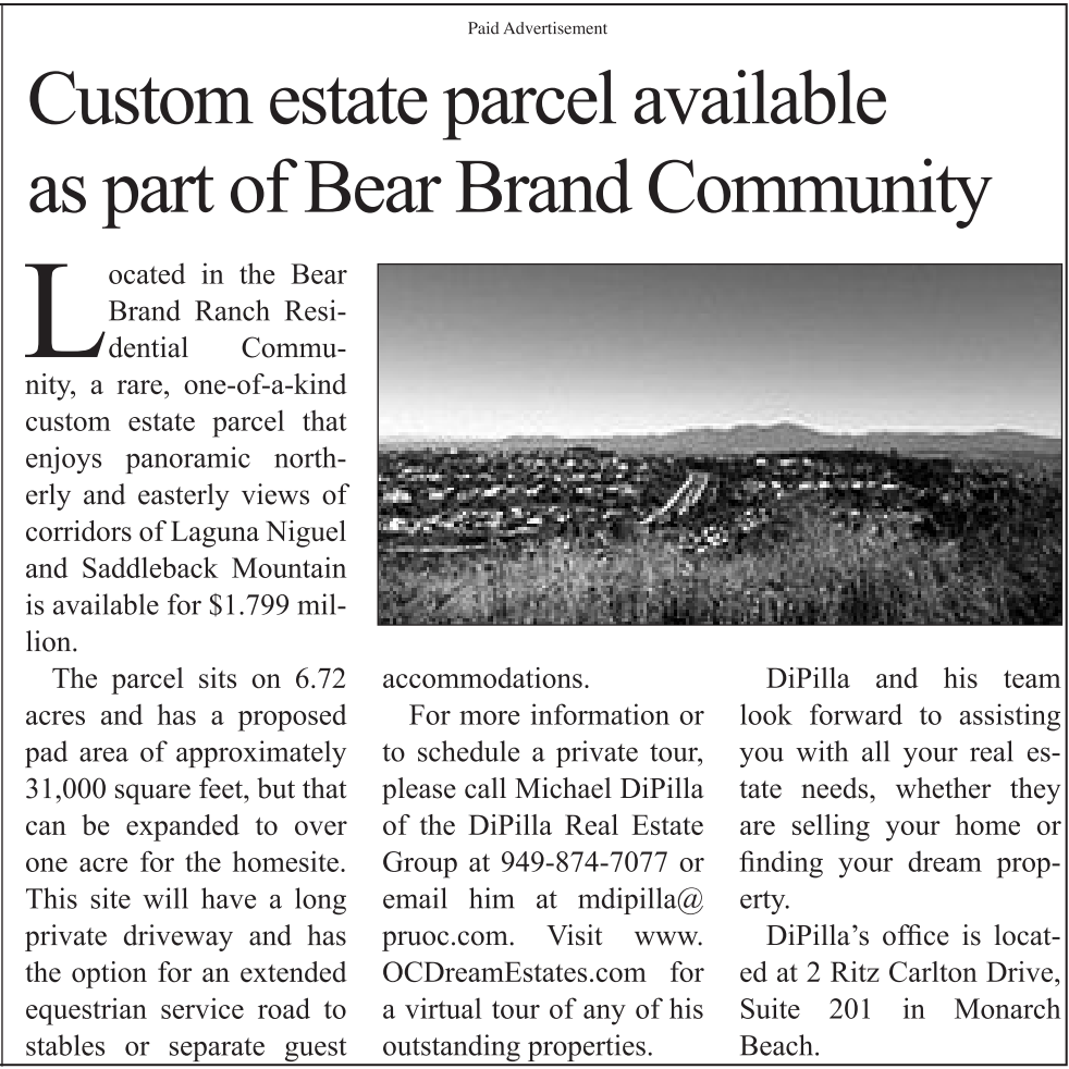 Paid Advertisement Custom estate parcel available as part of Bear Brand Community Located in the Bear Brand Ranch Residential Community, a rare, one-of-a-kind custom estate parcel that enjoys panoramic northerly and easterly views of corridors of Laguna Niguel and Saddleback Mountain is available for $1.799 million. The parcel sits on 6.72 acres and has a proposed pad area of approximately 31,000 square feet, but that can be expanded to over one acre for the homesite. This site will have a long private driveway and has the option for an extended equestrian service road to stables or separate guest accommodations. For more information or to schedule a private tour, please call Michael DiPilla of the DiPilla Real Estate Group at 949-874-7077 or email him at mdipilla@ pruoc.com. Visit www. OCDreamEstates.com for a virtual tour of any of his outstanding properties. DiPilla and his team look forward to assisting you with all your real estate needs, whether they are selling your home or finding your dream property. DiPilla’s office is located at 2 Ritz Carlton Drive, Suite 201 in Monarch Beach. See also