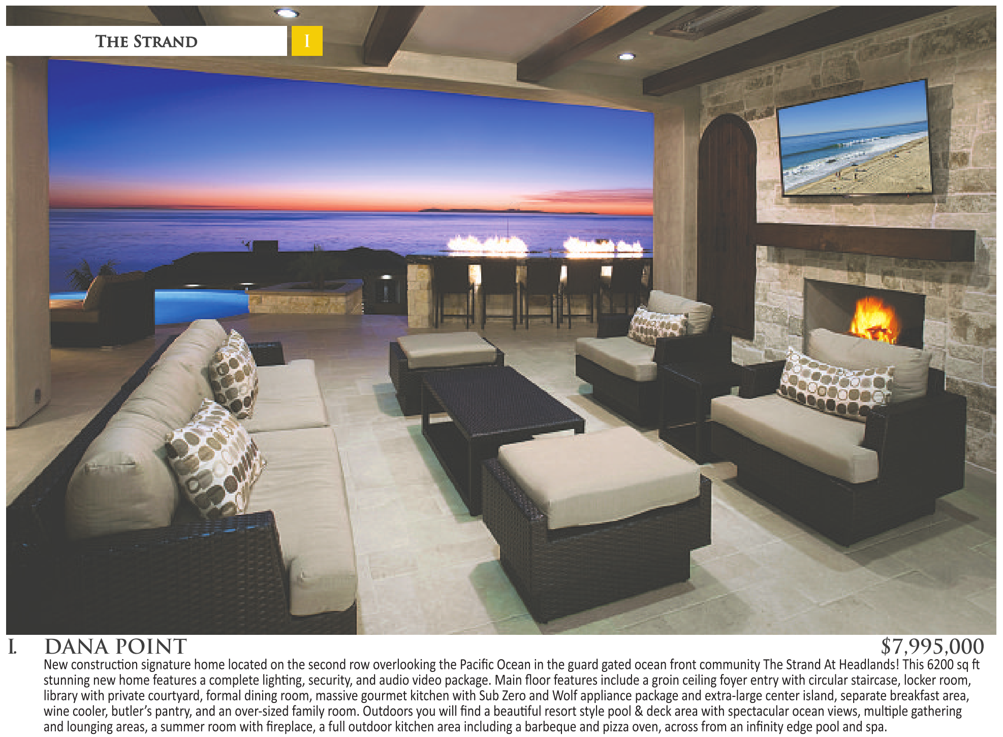 New construc on signature home located on the second row overlooking the Pacific Ocean in the guard gated ocean front community The Strand At Headlands! This 6200 sq stunning new home features a complete ligh ng, security, and audio video package. Main floor features include a groin ceiling foyer entry with circular staircase, locker room, library with private courtyard, formal dining room, massive gourmet kitchen with Sub Zero and Wolf appliance package and extra-large center island, separate breakfast area, wine cooler, butler’s pantry, and an over-sized family room. Outdoors you will find a beau ful resort style pool & deck area with spectacular ocean views, mul ple gathering and lounging areas, a summer room with fireplace, a full outdoor kitchen area including a barbeque and pizza oven, across from an infinity edge pool and spa.