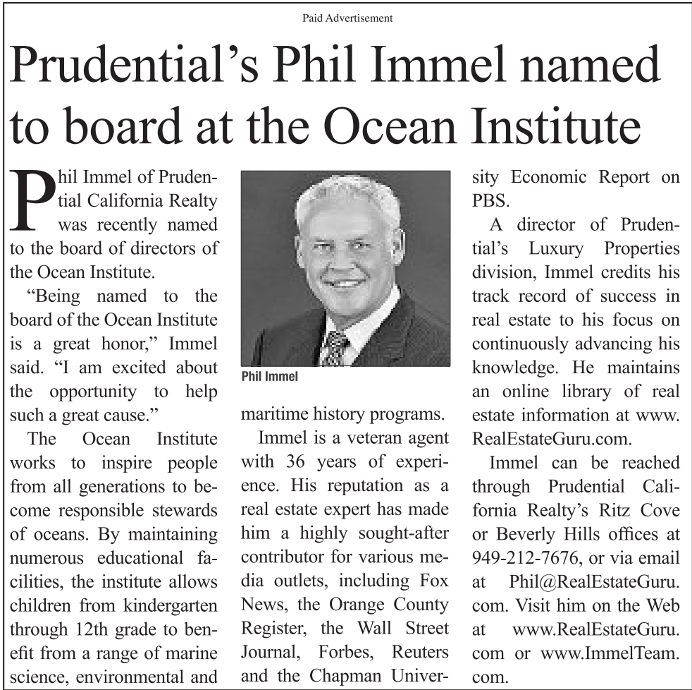 Paid Advertisement Prudential’s Phil Immel named to board at the Ocean Institute Phil Immel of Prudential California Realty was recently named to the board of directors of the Ocean Institute. “Being named to the board of the Ocean Institute is a great honor,” Immel said. “I am excited about the opportunity to help such a great cause.” The Ocean Institute works to inspire people from all generations to become responsible stewards of oceans. By maintaining numerous educational facilities, the institute allows children from kindergarten through 12th grade to benefit from a range of marine science, environmental and Phil Immel maritime history programs. Immel is a veteran agent with 36 years of experience. His reputation as a real estate expert has made him a highly sought-after contributor for various media outlets, including Fox News, the Orange County Register, the Wall Street Journal, Forbes, Reuters and the Chapman Univer sity Economic Report on PBS. A director of Prudential’s Luxury Properties division, Immel credits his track record of success in real estate to his focus on continuously advancing his knowledge. He maintains an online library of real estate information at www. RealEstateGuru.com. Immel can be reached through Prudential California Realty’s Ritz Cove or Beverly Hills offices at 949-212-7676, or via email at Phil@RealEstateGuru. com. Visit him on the Web at www.RealEstateGuru. com or www.ImmelTeam. com. See also