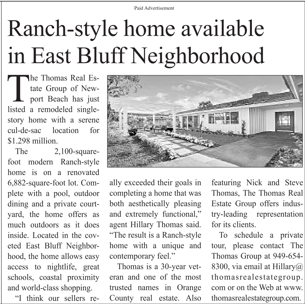 The 2,100-squarefoot modern Ranch-style home is on a renovated 6,882-square-foot lot. Complete with a pool, outdoor dining and a private courtyard, the home offers as much outdoors as it does inside. Located in the coveted East Bluff Neighborhood, the home allows easy access to nightlife, great schools, coastal proximity and world-class shopping.
