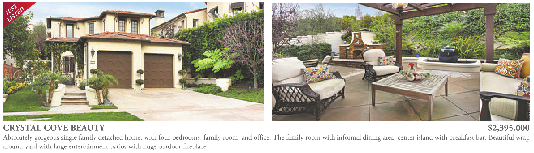 CRYSTAL COVE BEAUTY $2,395,000 Absolutely gorgeous single family detached home, with four bedrooms, family room, and office. The family room with informal dining area, center island with breakfast bar. Beautiful wrap around yard with large entertainment patios with huge outdoor fireplace.