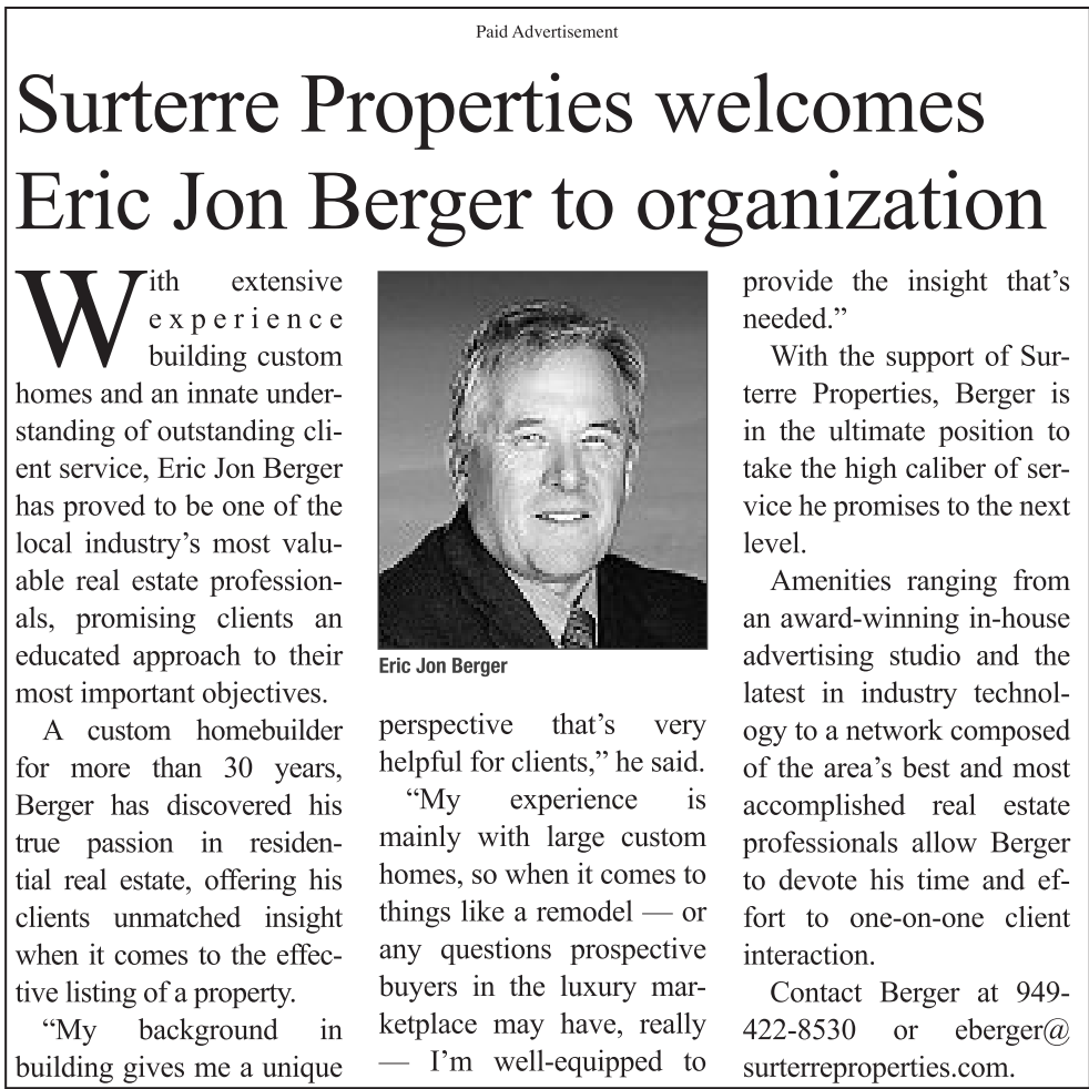 Contact Berger at 949- 422-8530 or eberger@ surterreproperties.com.