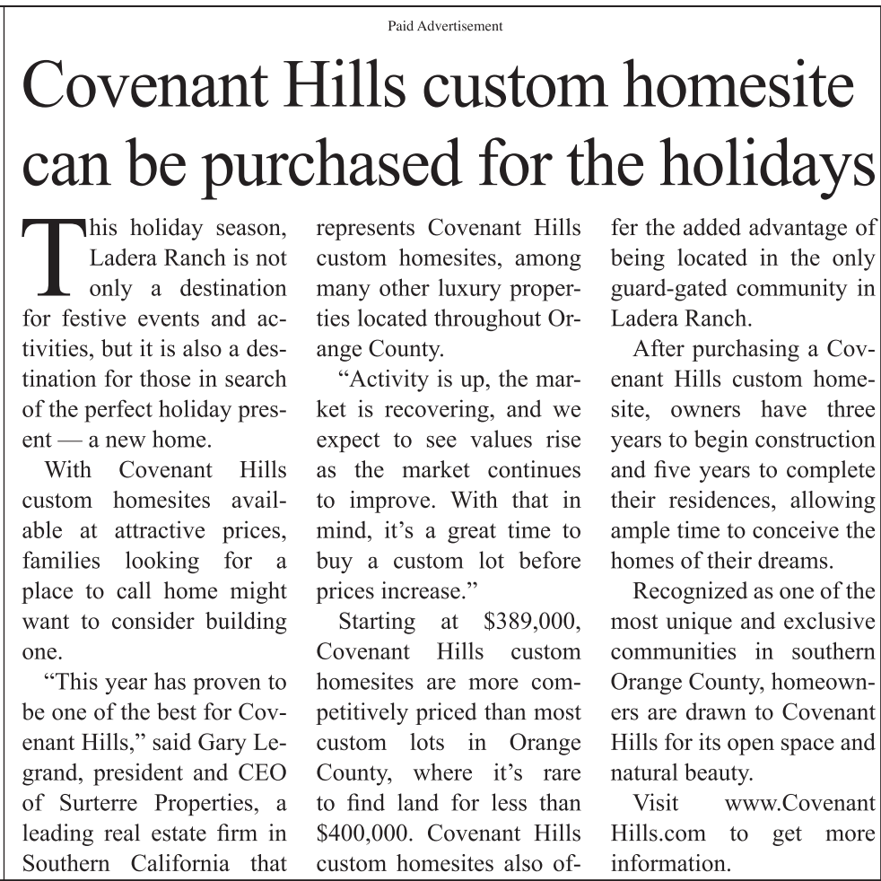 “This year has proven to be one of the best for Covenant Hills,” said Gary Legrand, president and CEO of Surterre Properties, a leading real estate firm in Southern California that