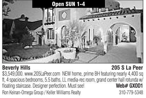 Open SUN 1-4 Beverly Hills 205 SLaPeer $3,549,000. www.205LaPeer.com NEW home, prime BH featuring nearly 4,400 sq ft, 4spacious bedrooms, 5.5 baths, LL media-rec room, grand center hall rotunda w/ floating staircase. Designer perfection. Must see! Web# GXOD1 RonKeinan-Omega Group /Keller Williams Realty 310-779-5348 See also