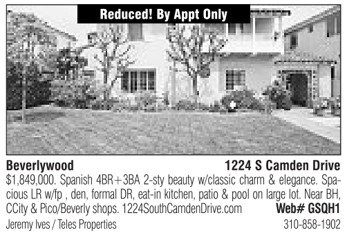 Reduced! By Appt Only Beverlywood 1224 SCamden Drive $1,849,000. Spanish 4BR+3BA 2-sty beauty w/classic charm &elegance. Spacious LR w/fp ,den, formal DR, eat-in kitchen, patio &pool on large lot. Near BH, CCity &Pico/Beverly shops. 1224SouthCamdenDrive.com Web# GSQH1 Jeremy Ives /Teles Properties 310-858-1902