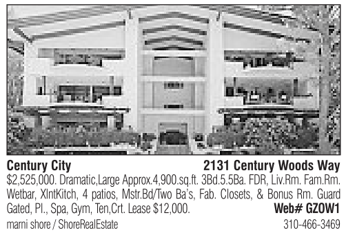 CenturyCity 2131 CenturyWoods Way $2,525,000. Dramatic,Large Approx.4,900.sq.ft. 3Bd.5.5Ba. FDR, Liv.Rm. Fam.Rm. Wetbar, XlntKitch, 4patios, Mstr.Bd/Two Ba’s, Fab. Closets, &Bonus Rm. Guard Gated, Pl., Spa, Gym, Ten,Crt. Lease $12,000. Web# GZOW1 marni shore/ShoreRealEstate 310-466-3469