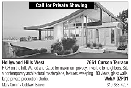 Call for Private Showing Hollywood Hills West 7661 Curson Terrace HIGH on the hill, Walled and Gated for maximum privacy,invisible to neighbors. Sits acontemporary architectural masterpiece, features sweeping 180 views, glass walls, large private production studio. Web# GZPO1 Mary Cronin /Coldwell Banker 310-633-4257