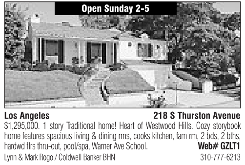 Open Sunday 2-5 LosAngeles 218 SThurston Avenue $1,295,000. 1 story Traditional home! Heart of Westwood Hills. Cozy storybook home features spacious living &dining rms, cooks kitchen, fam rm, 2bds, 2bths, hardwd flrs thru-out, pool/spa, Warner Ave School. Web# GZLT1 Lynn &Mark Rogo /Coldwell Banker BHN 310-777-6213
