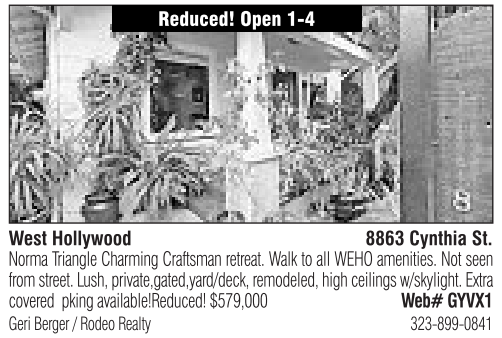 Norma Triangle Charming Craftsman retreat. Walk to all WEHO amenities. Not seen from street. Lush, private,gated,yard/deck, remodeled, high ceilings w/skylight. Extra covered pking available!Reduced! $579,000 Web# GYVX1