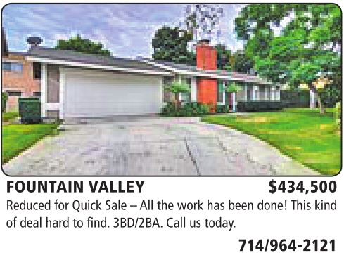 FOUNTAIN VALLEY $434,500 Reduced for Quick Sale –All the work has been done! This kind of deal hard to find. 3BD/2BA. Call us today.