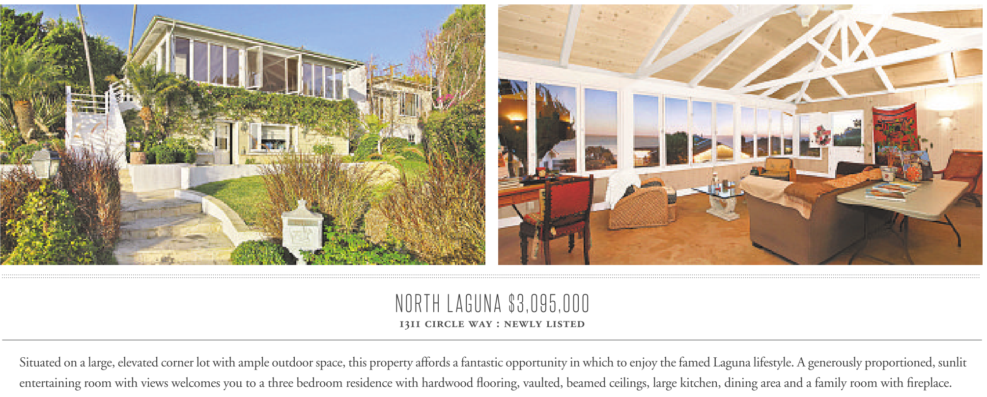 NORTH LAGUNA $3,095,000 1311 circle way : newly listed Situated on alarge, elevated corner lot with ample outdoor space, this property affords afantastic opportunity in which to enjoy the famed Laguna lifestyle. Agenerously proportioned, sunlit entertaining room with views welcomes you to a three bedroom residence with hardwood flooring, vaulted, beamed ceilings, large kitchen, dining area and a family room with fireplace.