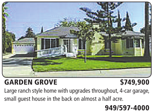 GARDEN GROVE $749,900 Large ranch style home with upgrades throughout, 4-car garage, smallguest house in the back on almost ahalf acre.