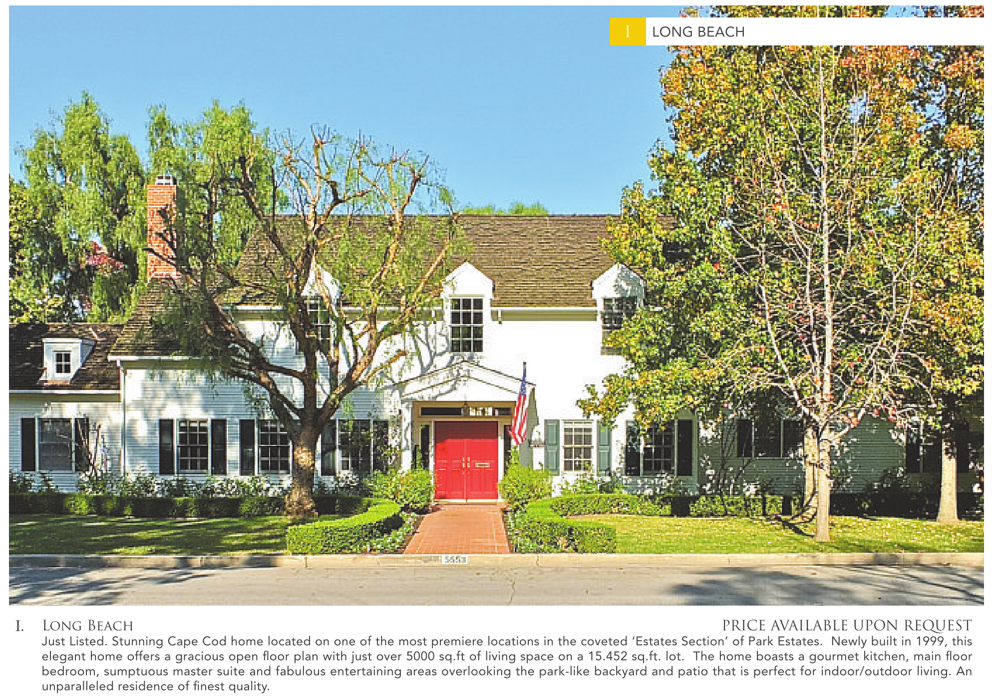I. Long Beach PRICE AVAILABLE UPON REQUEST Just Listed. Stunning Cape Cod home located on one of the most premiere locations in the coveted ‘Estates Section’ of Park Estates. Newly built in 1999, this elegant home offers a gracious open floor plan with just over 5000 sq.ft of living space on a 15.452 sq.ft. lot. The home boasts a gourmet kitchen, main floor bedroom, sumptuous master suite and fabulous entertaining areas overlooking the park-like backyard and patio that is perfect for indoor/outdoor living. An unparalleled residence of finest quality.