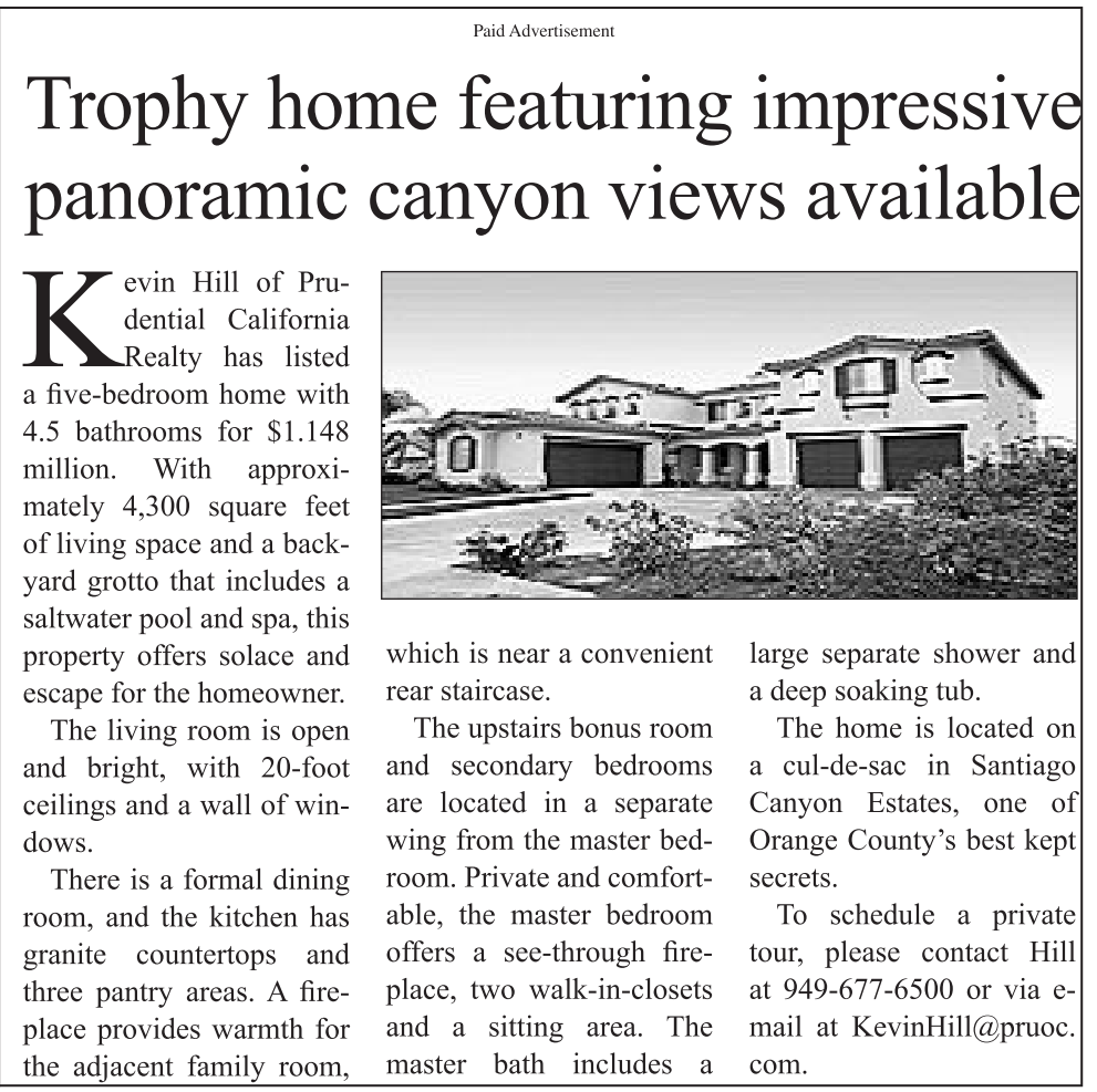 Hill of Prudential California Realty has listed a five-bedroom home with 4.5 bathrooms for $1.148 million. With approximately 4,300 square feet of living space and a backyard grotto that includes a saltwater pool and spa, this property offers solace and escape for the homeowner.