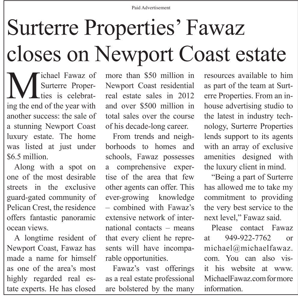 Paid Advertisement Surterre Properties’ Fawaz closes on Newport Coast estate Michael Fawaz of Surterre Properties is celebrating the end of the year with another success: the sale of a stunning Newport Coast luxury estate. The home was listed at just under $6.5 million. Along with a spot on one of the most desirable streets in the exclusive guard-gated community of Pelican Crest, the residence offers fantastic panoramic ocean views. A longtime resident of Newport Coast, Fawaz has made a name for himself as one of the area’s most highly regarded real estate experts. He has closed more than $50 million in Newport Coast residential real estate sales in 2012 and over $500 million in total sales over the course of his decade-long career. From trends and neighborhoods to homes and schools, Fawaz possesses a comprehensive expertise of the area that few other agents can offer. This ever-growing knowledge – combined with Fawaz’s extensive network of international contacts – means that every client he represents will have incomparable opportunities. Fawaz’s vast offerings as a real estate professional are bolstered by the many resources available to him as part of the team at Surterre Properties. From an inhouse advertising studio to the latest in industry technology, Surterre Properties lends support to its agents with an array of exclusive amenities designed with the luxury client in mind. “Being a part of Surterre has allowed me to take my commitment to providing the very best service to the next level,” Fawaz said. Please contact Fawaz at 949-922-7762 or michael@michaelfawaz. com. You can also visit his website at www. MichaelFawaz.comformore information. See also