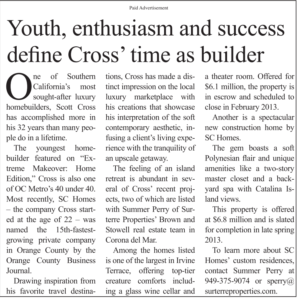 of Southern California’s most sought-after luxury homebuilders, Scott Cross has accomplished more in his 32 years than many people do in a lifetime.