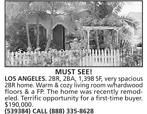LOS ANGELES. 2BR, 2BA, 1,398 SF,very spacious 2BR home. Warm &cozy living room w/hardwood floors & a FP. The home was recently remodeled. Terrific opportunity for afirst-time buyer.