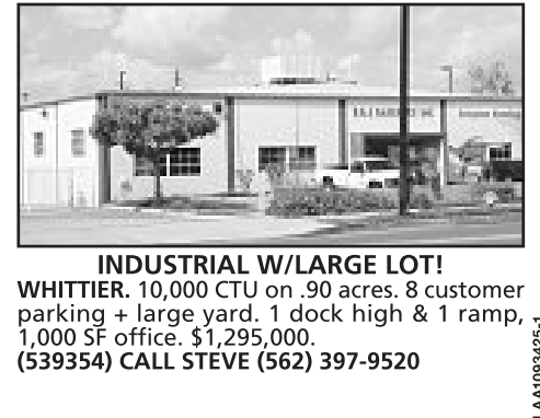 WHITTIER. 10,000 CTU on .90 acres. 8customer parking + large yard. 1 dock high & 1 ramp, 1,000 SF office. $1,295,000. (539354) CALL STEVE (562) 397-9520