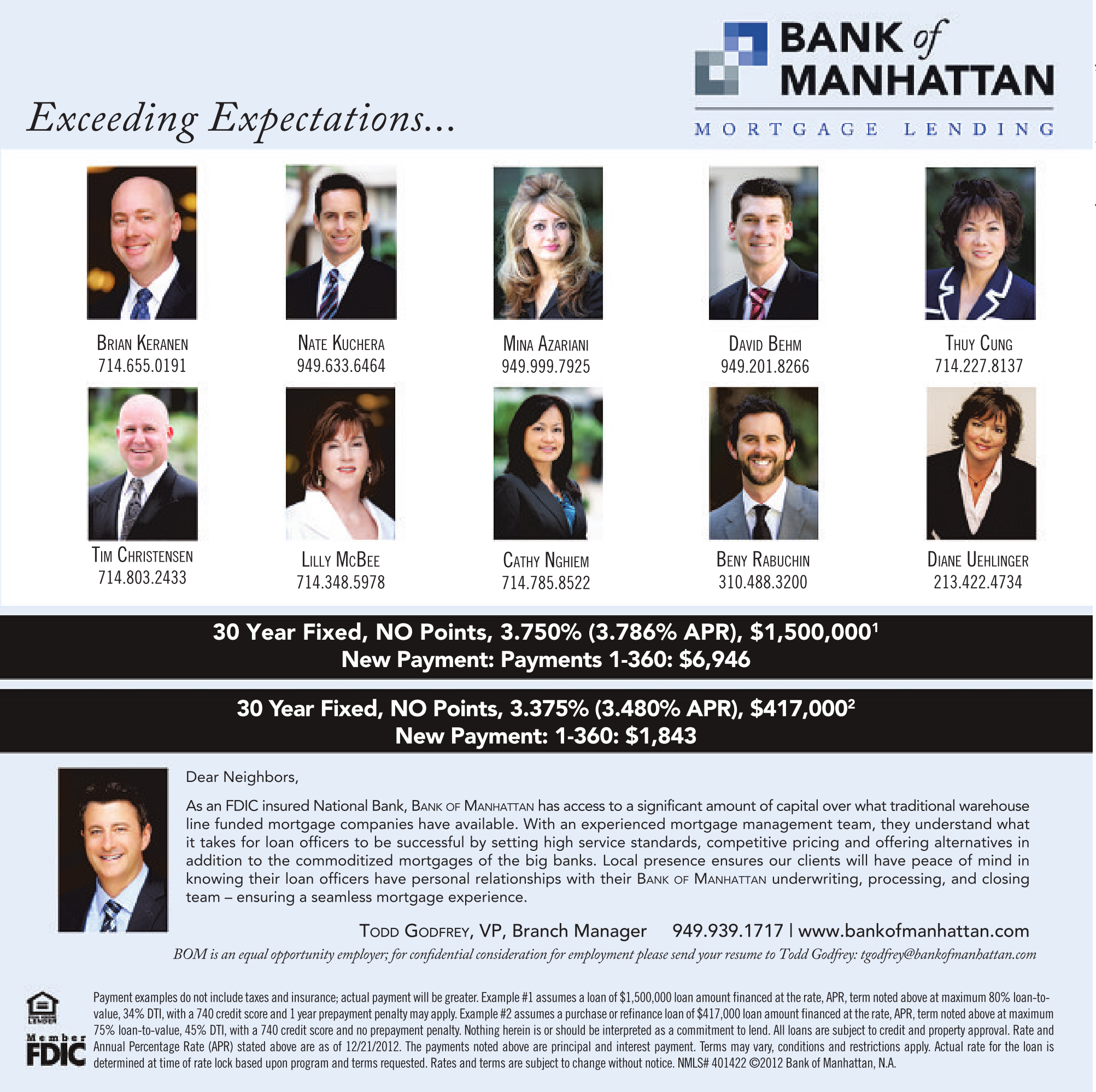 Payment examples do not include taxes and insurance; actual payment will be greater.Example #1 assumes aloan of $1,500,000 loan amount financed at the rate, APR, term noted above at maximum 80% loan-tovalue, 34% DTI, with a740 credit score and 1year prepayment penalty may apply.Example #2 assumes apurchase or refinance loan of $417,000 loan amount financed at the rate, APR, term noted above at maximum 75% loan-to-value, 45% DTI, with a740 credit score and no prepayment penalty.Nothing herein is or should be interpreted as acommitment to lend. All loans are subject to credit and property approval. Rate and Annual Percentage Rate (APR) stated above are as of 12/21/2012. The payments noted above are principal and interest payment. Terms may vary, conditions and restrictions apply. Actual rate for the loan is determined at time of rate lock based upon program and terms requested. Rates and terms are subject to change without notice. NMLS# 401422 ©2012 Bank of Manhattan, N.A.