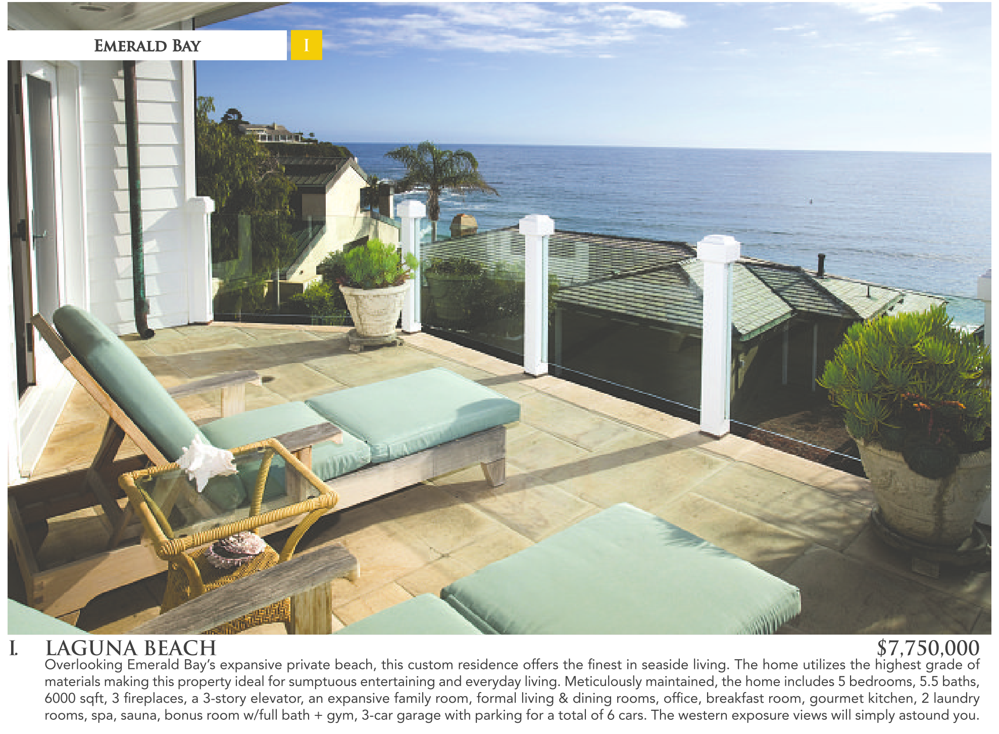 Emerald Bay Emerald Bay I I. LAGUNA BEACH $7,750,000 Overlooking Emerald Bay’s expansive private beach, this custom residence offers the finest in seaside living. The home utilizes the highest grade of materials making this property ideal for sumptuous entertaining and everyday living. Meticulously maintained, the home includes 5 bedrooms, 5.5 baths, 6000 sqft, 3 fireplaces, a 3-story elevator, an expansive family room, formal living & dining rooms, office, breakfast room, gourmet kitchen, 2 laundry rooms, spa, sauna, bonus room w/full bath + gym, 3-car garage with parking for a total of 6 cars. The western exposure views will simply astound you.