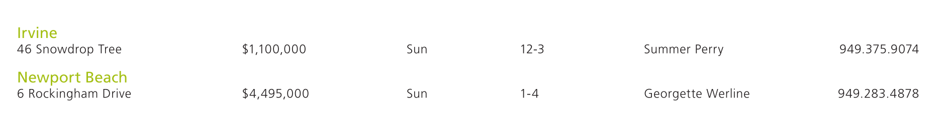 Irvine 46 Snowdrop Tree $1,100,000 Sun 12-3 Summer Perry 949.375.9074 Newport Beach 6 Rockingham Drive $4,495,000 Sun 1-4 Georgette Werline 949.283.4878