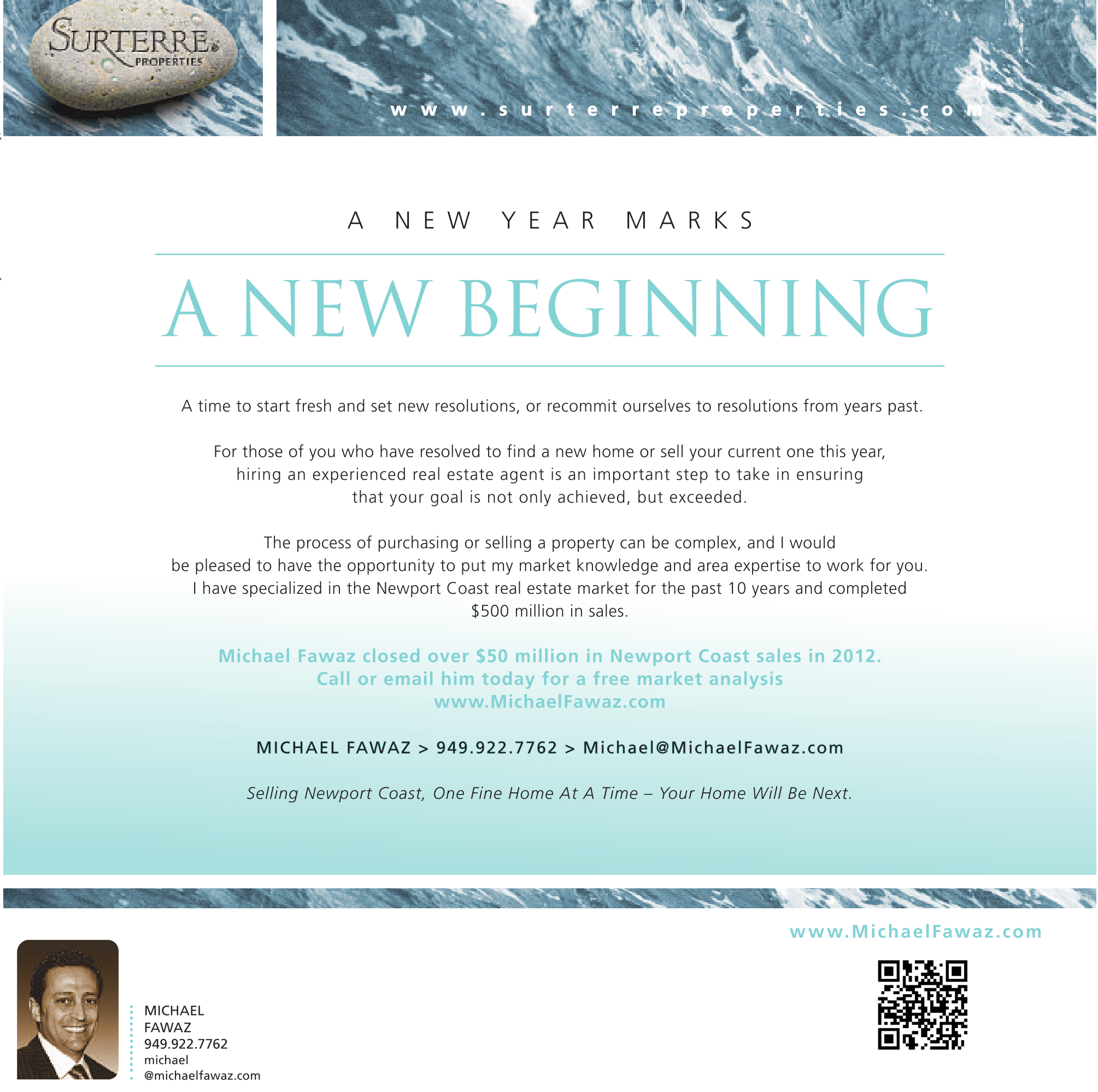 14 w w w . s u r t e r r e p r o p e r t i e s . c o m A N E W Y E A R M A R K S A NEW BEGINNING A time to start fresh and set new resolutions, or recommit ourselves to resolutions from years past. For those of you who have resolved to find a new home or sell your current one this year, hiring an experienced real estate agent is an important step to take in ensuring that your goal is not only achieved, but exceeded. The process of purchasing or selling a property can be complex, and I would be pleased to have the opportunity to put my market knowledge and area expertise to work for you. I have specialized in the Newport Coast real estate market for the past 10 years and completed $500 million in sales. Michael Fawaz closed over $50 million in Newport Coast sales in 2012. Call or email him today for a free market analysis www.MichaelFawaz.com MICHAEL FAWAZ > 949.922.7762 > Michael@MichaelFawaz.com Selling Newport Coast, One Fine Home At A Time – Your Home Will Be Next. www.MichaelFawaz.com MICHAEL FAWAZ 949.922.7762 michael @michaelfawaz.com