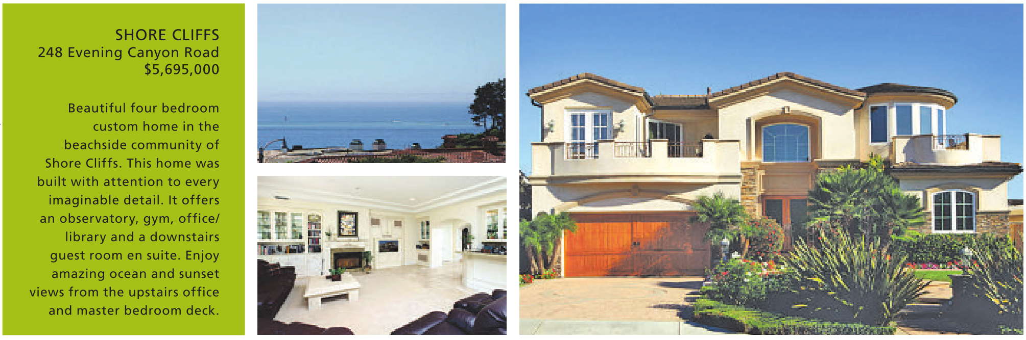 SHORE CLIFFS 248 Evening Canyon Road $5,695,000 Beautiful four bedroom custom home in the beachside community of Shore Cliffs. This home was built with attention to every imaginable detail. It offers an observatory, gym, office/ library and a downstairs guest room en suite. Enjoy amazing ocean and sunset views from the upstairs office and master bedroom deck.