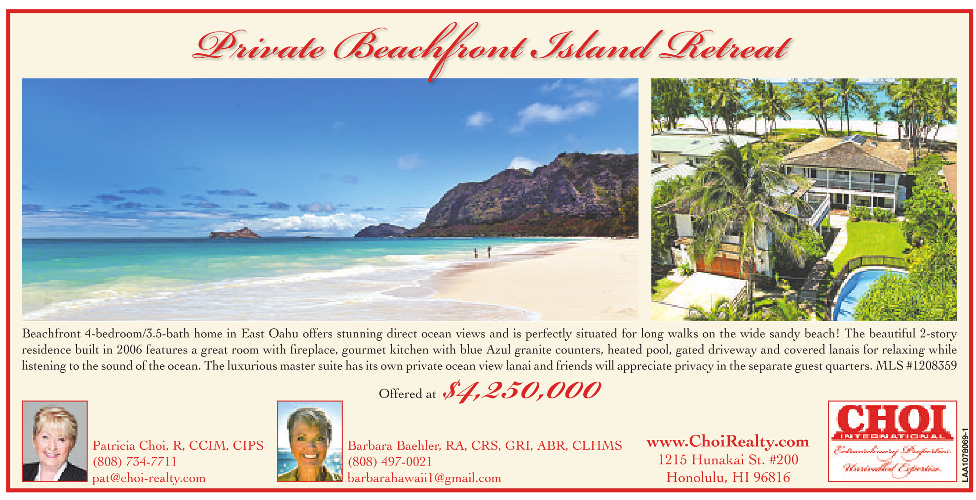 Private Beachfront Island Retreat Beachfront 4-bedroom/3.5-bath home in East Oahu offers stunning direct ocean views and is perfectly situated for long walks on the wide sandy beach! The beautiful 2-story residence built in 2006 features a great room with fireplace, gourmet kitchen with blue Azul granite counters, heated pool, gated driveway and covered lanais for relaxing while listening to the sound of the ocean. The luxurious master suite has its own private ocean view lanai and friends will appreciate privacy in the separate guest quarters. MLS #1208359 Offered at $4,250,000 Patricia Choi, R, CCIM, CIPS (808) 734-7711 pat@choi-realty.com Barbara Baehler, RA, CRS, GRI, ABR, CLHMS (808) 497-0021 barbarahawaii1@gmail.com www.ChoiRealty.com 1215 Hunakai St. #200 Honolulu, HI 96816