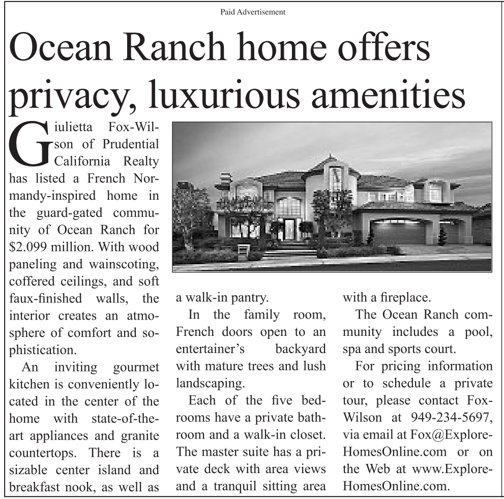 Fox-Wilson of Prudential California Realty has listed a French Normandy-inspired home in the guard-gated community of Ocean Ranch for $2.099 million. With wood paneling and wainscoting, coffered ceilings, and soft faux-finished walls, the interior creates an atmosphere of comfort and sophistication.