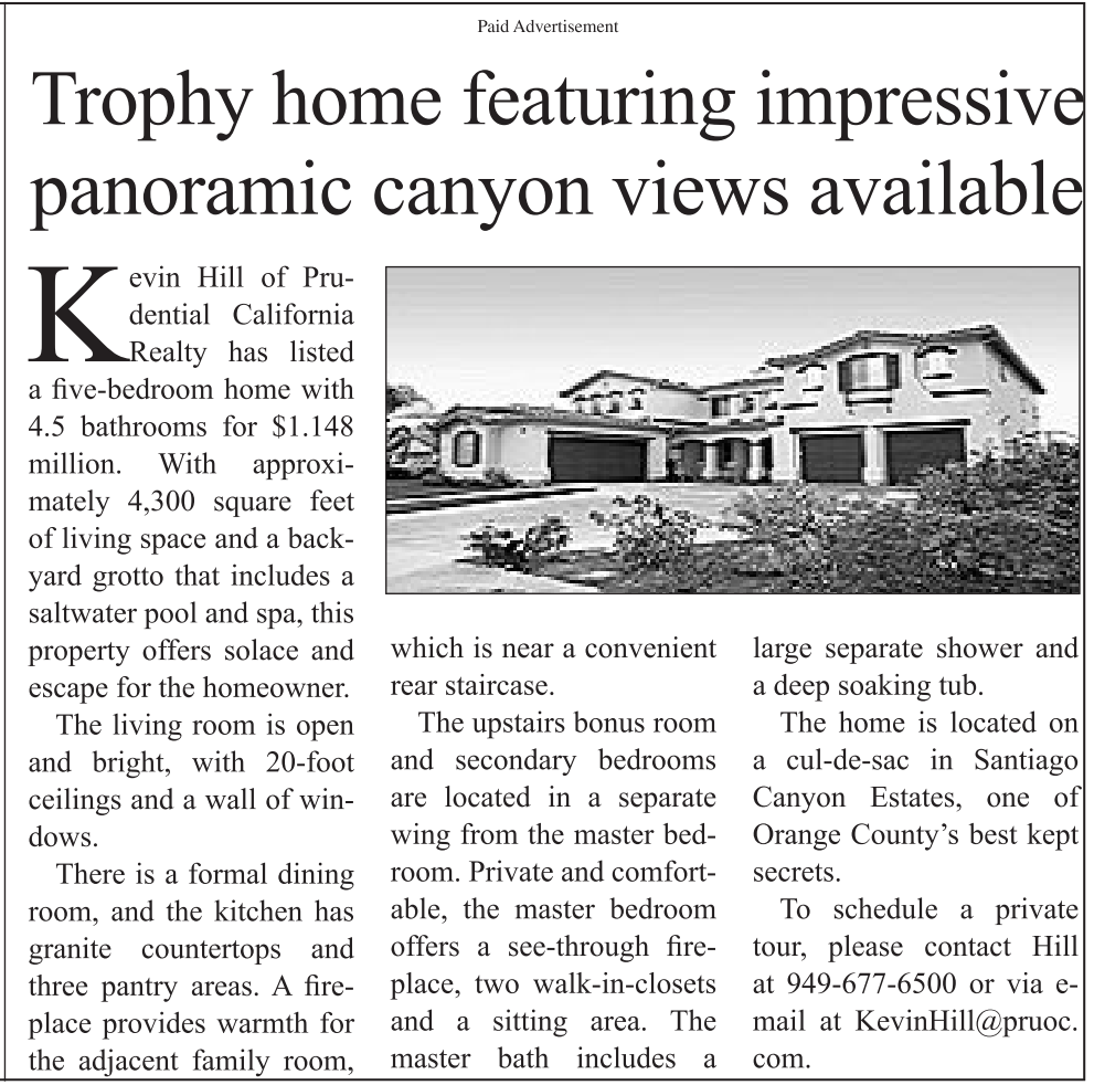 Paid Advertisement Trophy home featuring impressive panoramic canyon views available Kevin Hill of Prudential California Realty has listed a five-bedroom home with 4.5 bathrooms for $1.148 million. With approximately 4,300 square feet of living space and a backyard grotto that includes a saltwater pool and spa, this property offers solace and escape for the homeowner. The living room is open and bright, with 20-foot ceilings and a wall of windows. There is a formal dining room, and the kitchen has granite countertops and three pantry areas. A fireplace provides warmth for the adjacent family room, which is near a convenient rear staircase. The upstairs bonus room and secondary bedrooms are located in a separate wing from the master bedroom. Private and comfortable, the master bedroom offers a see-through fireplace, two walk-in-closets and a sitting area. The master bath includes a large separate shower and a deep soaking tub. The home is located on a cul-de-sac in Santiago Canyon Estates, one of Orange County’s best kept secrets. To schedule a private tour, please contact Hill at 949-677-6500 or via e- mail at KevinHill@pruoc. com. See also