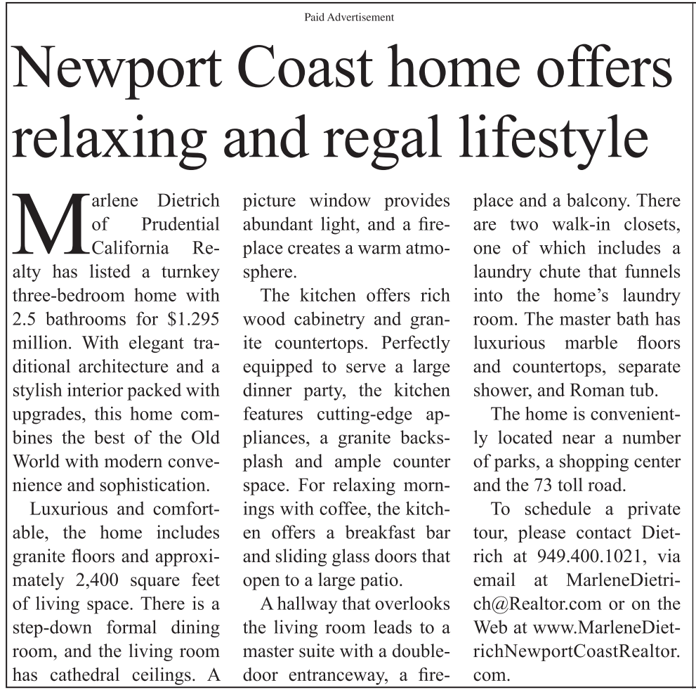 To schedule a private tour, please contact Dietrich at 949.400.1021, via email at MarleneDietrich@Realtor.com or on the Web at www.MarleneDietrichNewportCoastRealtor. com.