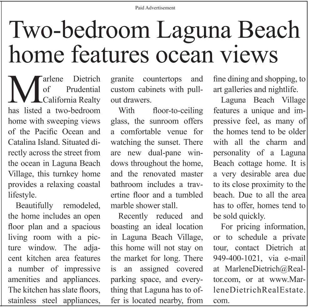Dietrich of Prudential California Realty has listed a two-bedroom home with sweeping views of the Pacific Ocean and Catalina Island. Situated directly across the street from the ocean in Laguna Beach Village, this turnkey home provides a relaxing coastal lifestyle.
