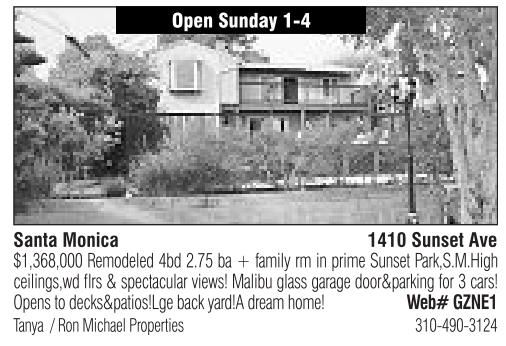 $1,368,000 Remodeled 4bd 2.75 ba +family rm in prime Sunset Park,S.M.High Opens to decks&patios!Lge back yard!A dream home! Web# GZNE1 Tanya /Ron Michael Properties 310-490-3124