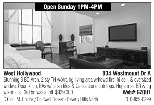 Open Sunday 1PM-4PM West Hollywood 834 Westmount Dr A Stunning 3BDArch. 2sty TH w/xtra lrgliving area w/hdwd flrs, hi ceil, &oversized wndws. Open kitch, BAs w/Italian tiles &Caesarstone cntr tops. Huge mstr BR &lrg wlk-in clst. 3rdbdwas aloft. $839,000. Web# GZQH1 C.Cain, M. Collins /Coldwell Banker -Beverly Hills North 310-859-6299