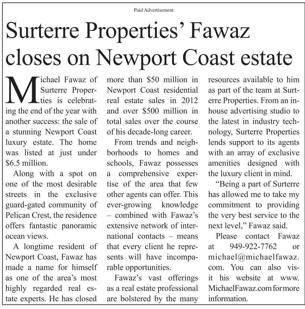 Fawaz of Surterre Properties is celebrating the end of the year with another success: the sale of a stunning Newport Coast luxury estate. The home was listed at just under $6.5 million.
