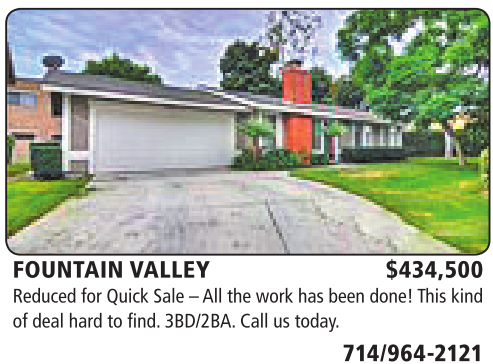 FOUNTAIN VALLEY $434,500 Reduced for Quick Sale –All the work has been done! This kind of deal hard to find. 3BD/2BA. Call us today.