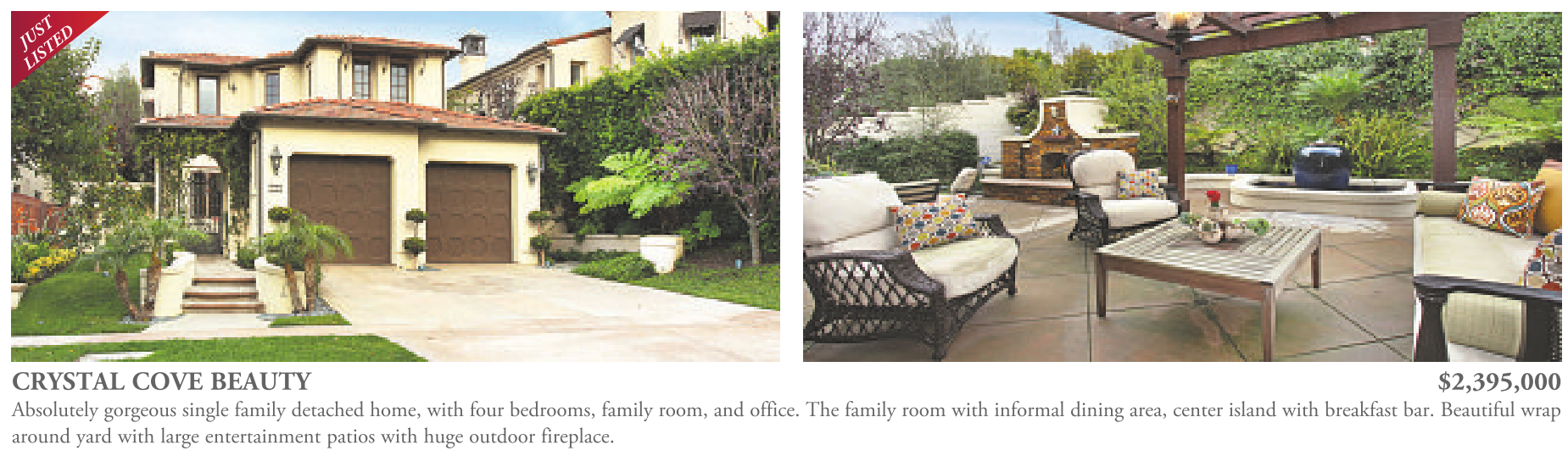 CRYSTAL COVE BEAUTY $2,395,000 Absolutely gorgeous single family detached home, with four bedrooms, family room, and office. The family room with informal dining area, center island with breakfast bar. Beautiful wrap