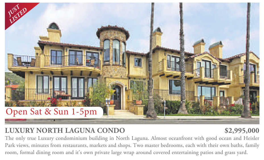 Open Sat & Sun 1-5pm LUXURY NORTH LAGUNA CONDO $2,995,000 The only true Luxury condominium building in North Laguna. Almost oceanfront with good ocean and Heisler Park views, minutes from restaurants, markets and shops. Two master bedrooms, each with their own baths, family room, formal dining room and it’s own private large wrap around covered entertaining patios and grass yard.