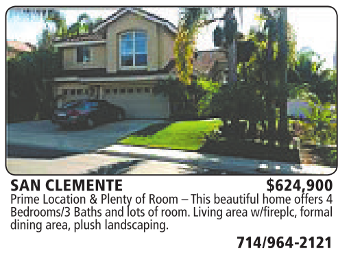 SAN CLEMENTE $624,900 Prime Location &Plenty of Room –This beautiful home offers 4 Bedrooms/3 Bathsand lots of room. Living area w/fireplc, formal dining area,plush landscaping.
