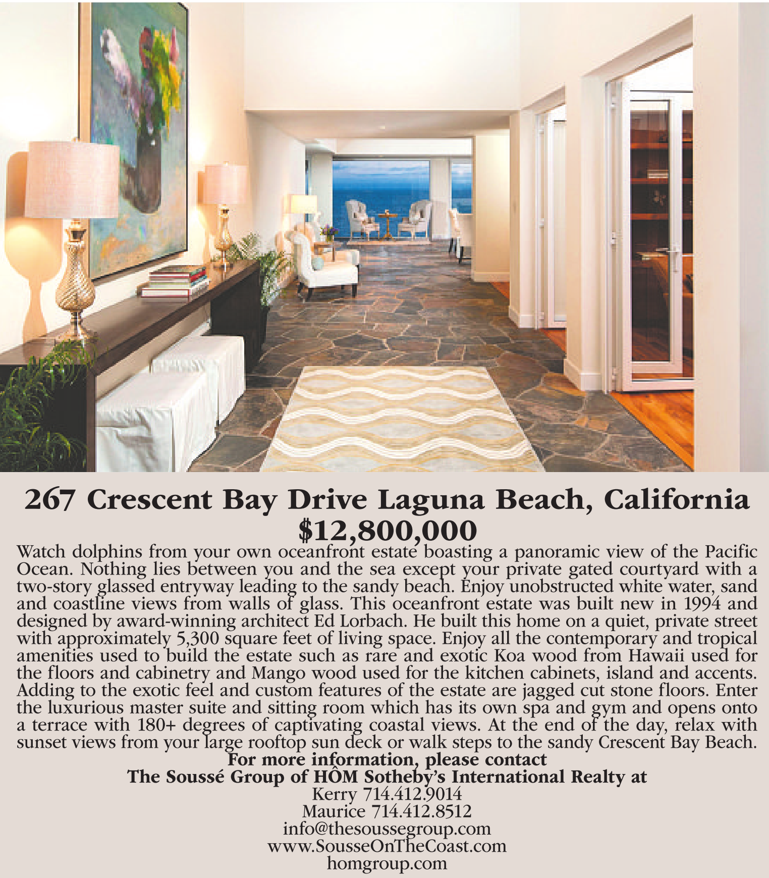 For more information, please contact The Soussé Group of HÔM Sotheby’s International Realty at Kerry 714.412.9014 Maurice 714.412.8512 info@thesoussegroup.com www.SousseOnTheCoast.com homgroup.com