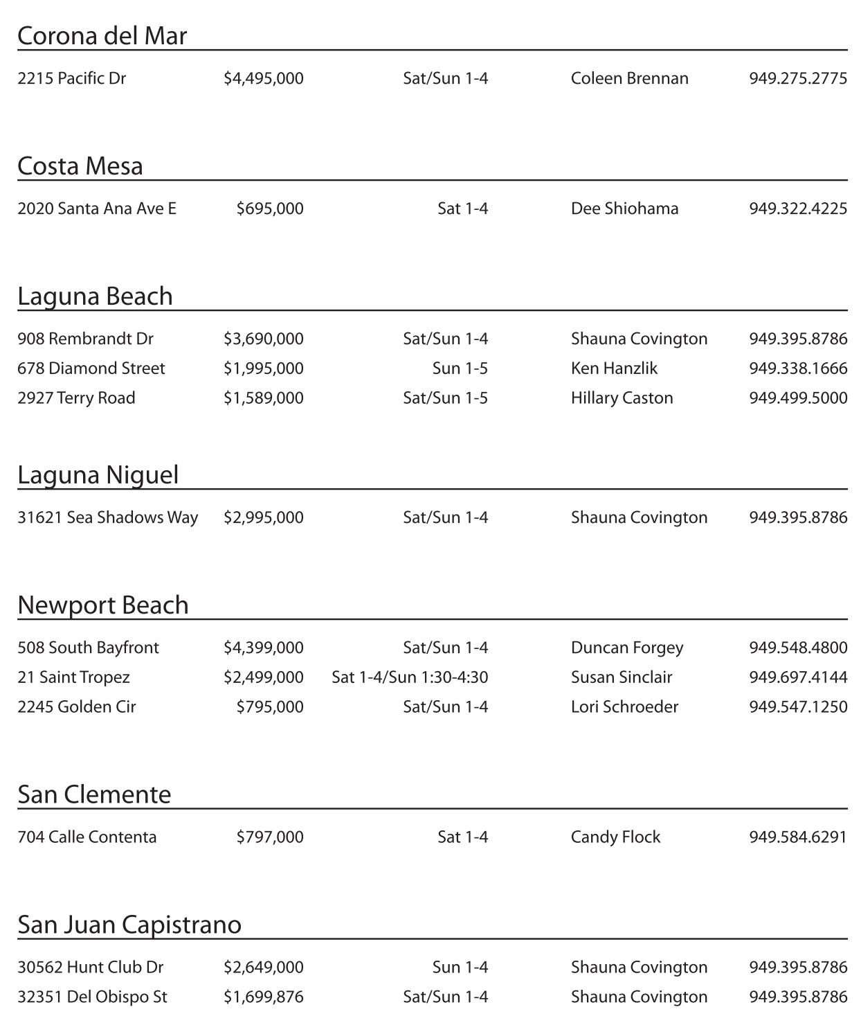 908 Rembrandt Dr $3,690,000 Sat/Sun 1-4 Shauna Covington 949.395.8786 678 Diamond Street $1,995,000 Sun 1-5 Ken Hanzlik 949.338.1666 2927 TerryRoad $1,589,000 Sat/Sun 1-5 HillaryCaston 949.499.5000